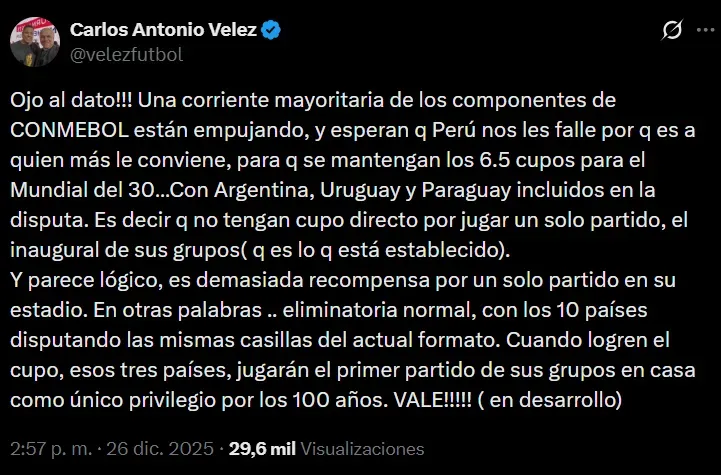 El comunicador colombiano-hispano, señaló, “Una corriente mayoritaria de los componentes de CONMEBOL están empujando, y esperan que Perú nos les falle porque es a quien más le conviene,para que se mantengan los 6.5 cupos para el Mundial del 30, con Argentina, Uruguay y Paraguay incluidos en la disputa”, lo que provocaría un cambio importante de cara a la próxima eliminatoria.