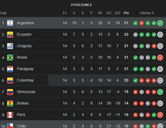Actualmente, Chile ocupa el último lugar en la tabla con apenas 10 unidades en 14 encuentros, a cinco puntos de Venezuela, que se encuentra en zona de repechaje. Por su parte, Argentina ya tiene asegurada su presencia en el Mundial, liderando la clasificación con 31 puntos.