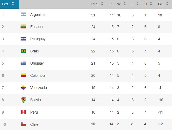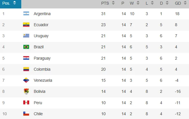 Con la derrota la selección chilena se mantiene colista (10°) con 10 puntos y peor diferencia de goles que Perú. Argentina sigue primera ahora con 34 unidades. La agonía de La Roja se extiende hasta este martes 10 de junio, cuando visite a Bolivia. La Albiceleste recibirá a Colombia.
