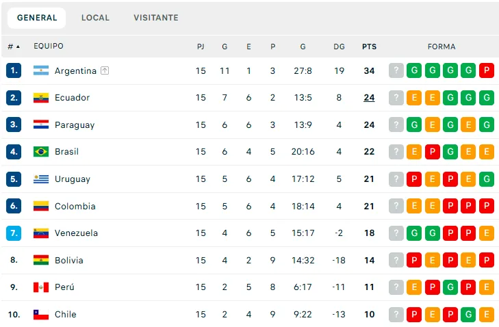 La Selección Chilena es colista y necesitada de ganar todo lo que viene: Así llegan los equipos a la fecha 15 de las Eliminatorias Sudamericanas al Mundial 2026.