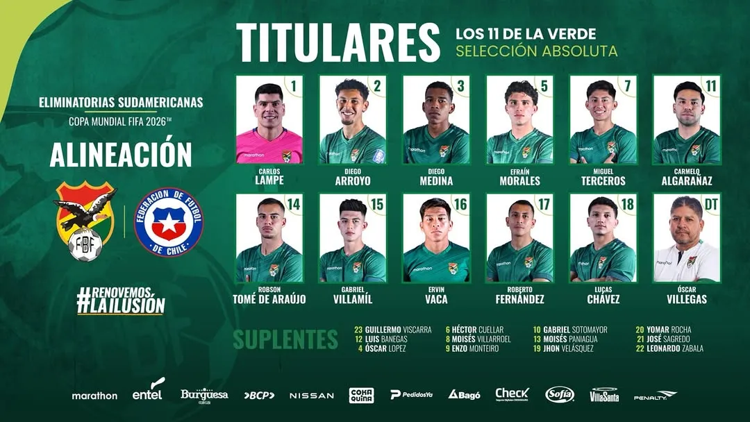 CARLOS LAMPE es la principal novedad que presenta el rival en su oncena titular. El técnico Óscar Villegas le da confianza al ex Huachipato en lugar de Guillermo Vizcarra, tras el error infantil que cometió ante Venezuela.