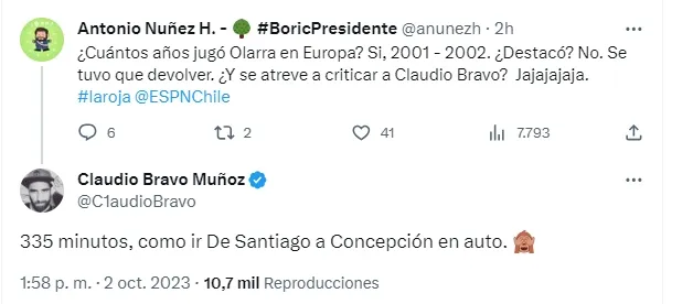 En medio de la polémica por quedar nuevamente al margen de las eliminatorias para el Mundial 2026, se enciende una nueva disputa, esta vez por Twitter (actual X) donde el portero compara sus minutos jugados en Europa, con un viaje Santiago a Concepción.