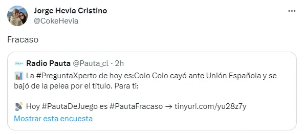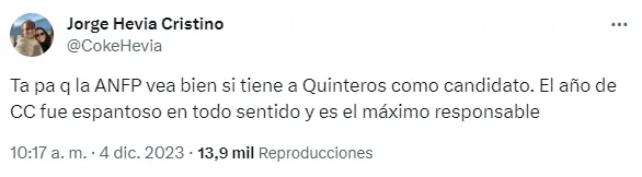 “Ta pa’ que la ANFP vea bien si tiene a Quinteros como candidato. El año de Colo Colo fue espantoso en todo sentido y (el DT) es el máximo responsable”, consideró Hevia en su cuenta de Twitter.