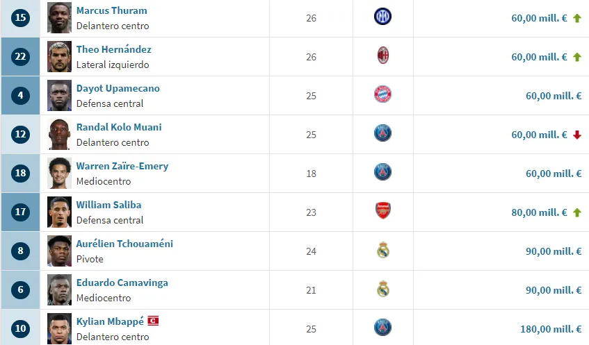 Detrás de Mbappé aparece un dúo del Real Madrid: Eduardo Camavinga y Aurelién Tchouaméni, quienes tienen un valor de 90 millones de euros. El zaguero central del Arsenal de Inglaterra William Saliba acecha el podio gracias a los 80 millones de la divisa que cuesta su carta.