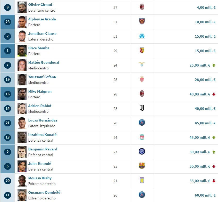 Y hay seis jugadores que tienen una tasación de 60 millones de euros. Randal Kolo Muani, Warren Zaire-Emery, Dayot Upamecano, Marcus Thuram, Ousmane Dembélé y Theo Hernández, quien debutó profesionalmente bajo la dirección técnica de Mauricio Pellegrino.