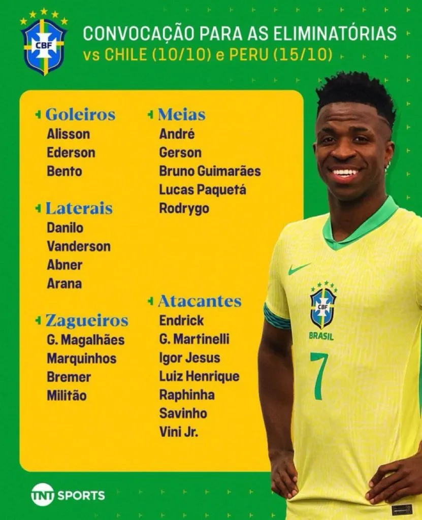 El resto de los convocados son los arqueros Alisson, Bento y Emerson, Los laterales Danilo, Vanderson, Abner y Arana. Defensas centrales con Bremer, Militao, Gabriel Magalhaes y Marquinhos. En el mediocampo citó a André, Bruno Guimaraes, Gerson y Paquetá.