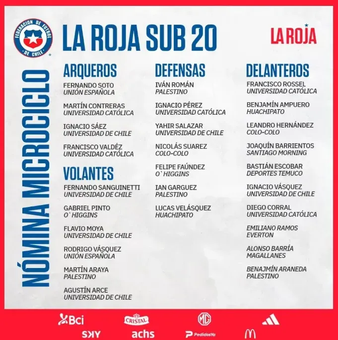 Nicolás Córdova citó 27 futbolistas para estos trabajos en Juan Pinto Durán. Universidad de Chile fue el club que más aportó, con siete convocados: Ignacio Sáez, Yahir Salazar, Agustín Arce, Fernando Sanguinetti, Flavio Moya e Ignacio Vásquez.