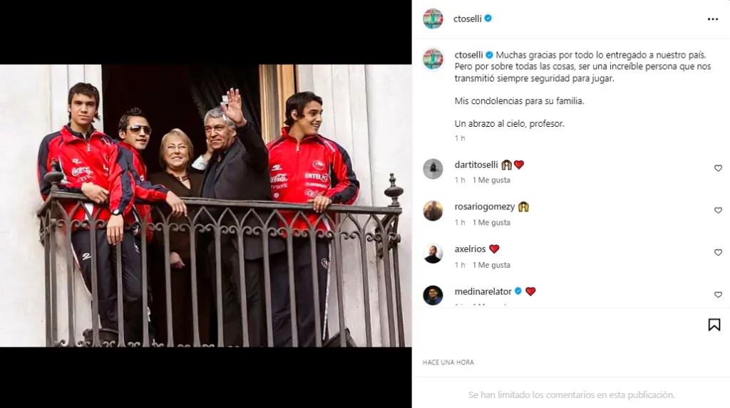 “Muchas gracias por todo lo entregado a nuestro país. Pero por sobre todas las cosas, ser una increíble persona que nos transmitió siempre seguridad para jugar. Mis condolencias para su familia. Un abrazo al cielo, profesor”, escribió en su Instagram con una verdadera fotaza.