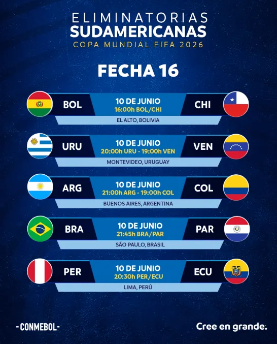 Es que la Conmebol dio a conocer la programación completa de la sobe jornada, con fecha y hora de los próximo partidos camino a México, Estados Unidos y Canadá 2026.