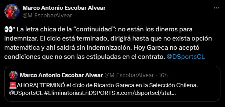 El comunicador utilizó su cuenta (@M_EscobarAlvear) para informar el porqué de la continuidad de Ricardo Gareca cuando todo parecía indicar que no lo haría, señalando que esta se debió a que no están los dineros para indemnizar al DT argentino, pero que, sin embargo, “El ciclo está terminado” y que Gareca “dirigirá hasta que no exista opción matemática y ahí saldrá sin indemnización” tal como lo indica su contrato.