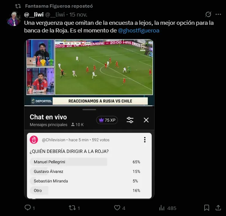 El DT chileno, días antes de dirigir su último duelo frente a Haití, compartió una imagen de la transmisión online del partido Chile vs. Rusia de CHV, en la que se realizaba una encuesta que preguntaba “¿quién debería dirigir a La Roja?”, cuestionario que contaba con cuatro alternativas: Manuel Pellegrini, Gustavo Álvarez, Sebastián Miranda y la opción “Otro”.