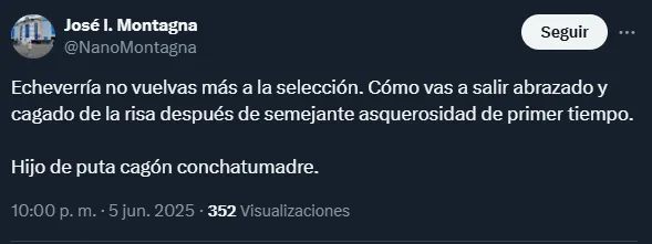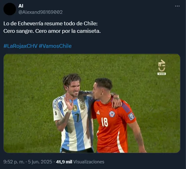 La escena no pasó por alto para los hinchas en redes sociales, donde no tuvieron piedad alguna por el mediocampista nacional. “Lo de Echeverría resume todo lo de Chile: cero sangre, cero amor por la camiseta“, comentó un usuario de X (ex Twitter).
