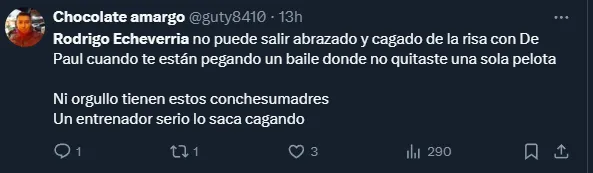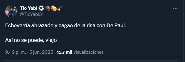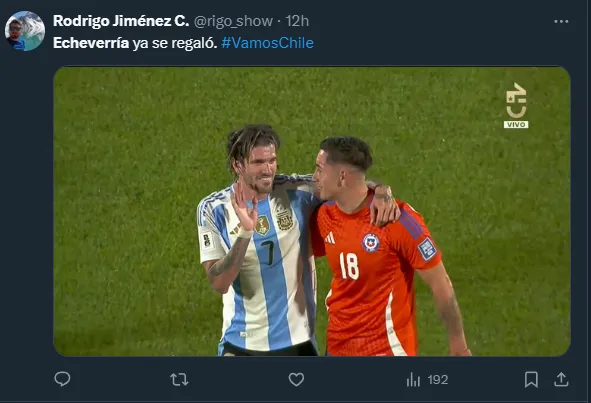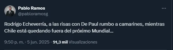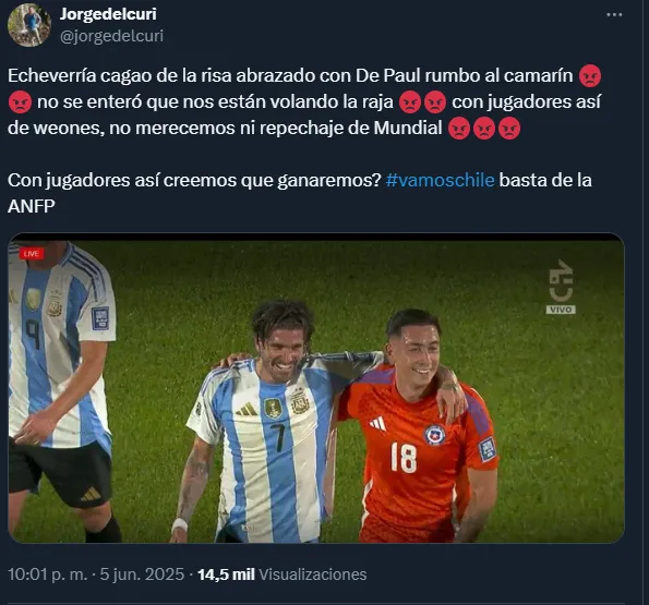 Otro fue aún más duro: “Rodrigo Echeverría a las risas con De Paul rumbo a camarines, mientras Chile está quedando fuera del próximo mundial”, escribió el reconocido periodista Pablo Ramos, en alusión al momento que vive la Roja.
