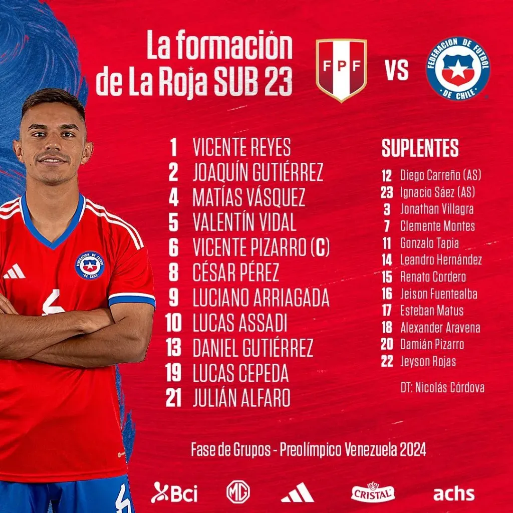 El capitán del conjunto nacional será el mediocampista de Colo Colo e hijo del histórico Jaime Pizarro, Vicente Pizarro, el Vicho.