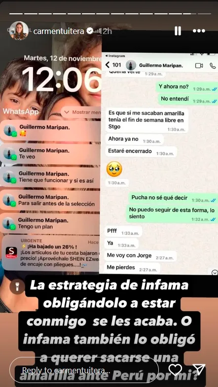 “La estrategia de Infama obligándolo a estar conmigo se les acaba. ¿O Infama también lo obligó a querer sacarse una amarilla ante Perú por mí?”, escribió Carmen.