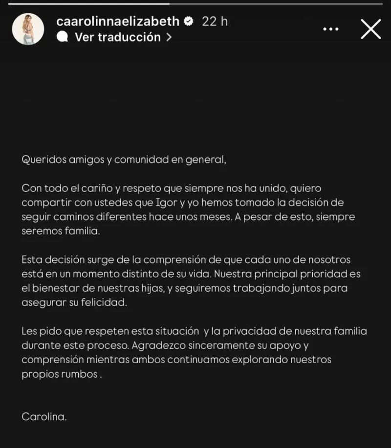 “Cada uno de nosotros está en un momento distinto de su vida. Nuestra principal prioridad es el bienestar de nuestras hijas, y seguiremos trabajando juntos para asegurar su felicidad (…) Les pido que respeten esta situación y la privacidad de nuestra familia durante este proceso”, agregó Carolina.
