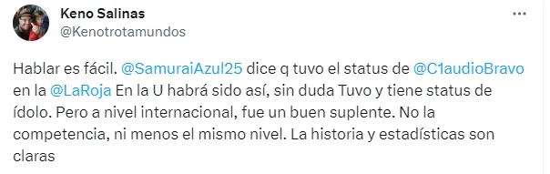“Hablar es fácil. Johnny Herrera dice que tuvo el status de Claudio Bravo en la selección chilena. En la U habrá sido así. Sin duda tuvo y tiene status de ídolo. Pero a nivel internacional fue un buen suplente. No (fue) la competencia (de Bravo) ni menos (tuvo) el mismo nivel. La historia y estadísticas son claras”, sostuvo Keno.