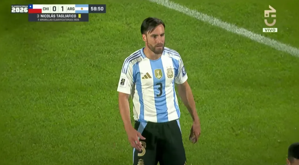 El lateral azul la baja con gran calidad desde su pecho y cuando se acomodaba para intentar avanzar o buscar el centro, recibe una fuerte patada por parte de Nicolás Tagliafico.