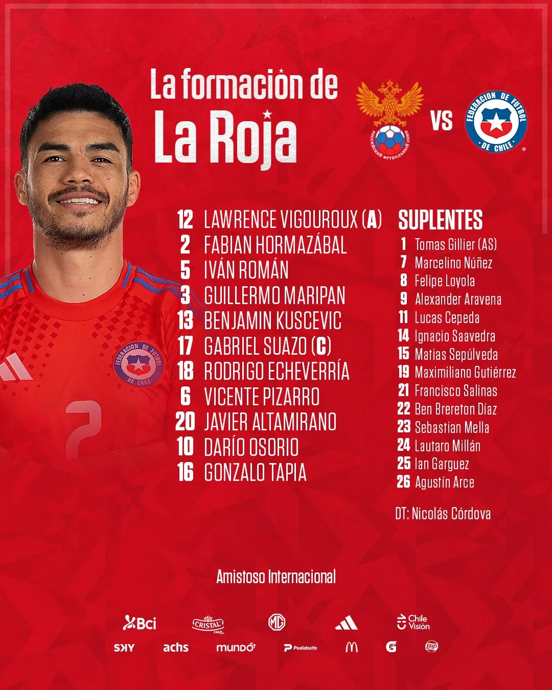 La Roja formará con Lawrece Vigouroux en el arco; Fabián Hormazábal, Iván Román, Guillermo Maripán, Benjamín Kuscevic, Gabriel Suazo en la defensa; Rodrigo Echeverría, Vicente Pizarro, Javier Altamirano en los volantes; Darío Osorio y Gonzalo Tapia en delantera.