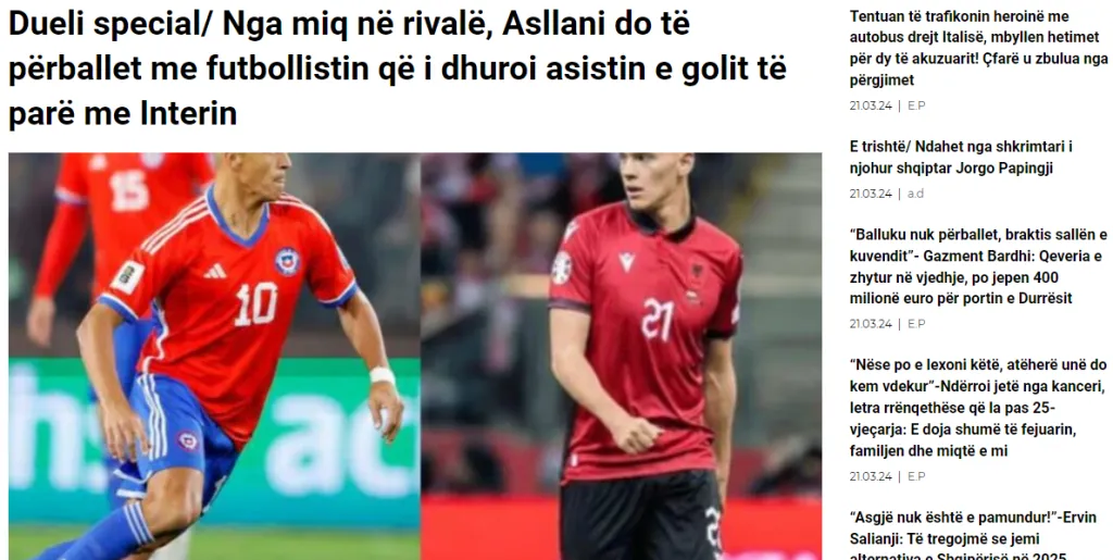 El medio europeo agrega que “el amistoso entre Albania y Chile será especial para los dos futbolistas del Inter, Kristjan Asllani y Aleksi Sánchez, que serán rivales con sus selecciones”.