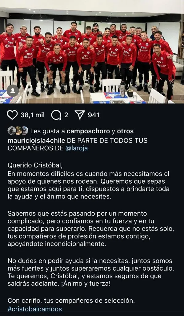 Fue en las redes sociales de Mauricio Isla, quien asume su rol del más experimentado de la actual selección chilena, que se mandó un potente mensaje para Cristóbal Campos.