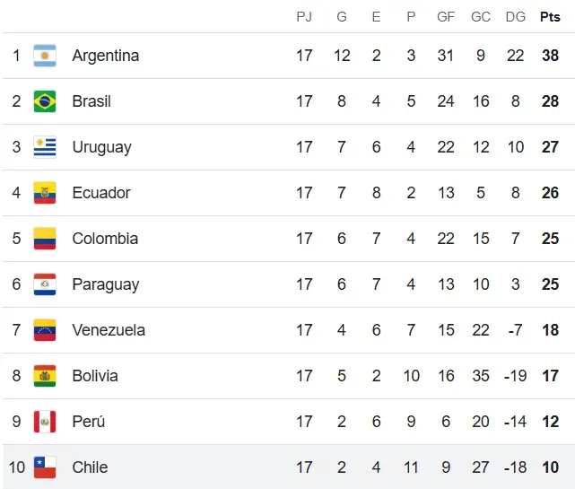 Con el empate La Roja sumó un punto y llegó a 11 unidades, última en la tabla (10°) superada por Perú (12), Venezuela (18), Bolivia (20), Paraguay (28), Brasil (28), Uruguay (28), Colombia (28), Ecuador (29) y Argentina (38). Chile había perdido opciones de clasificar en la pasada fecha FIFA.