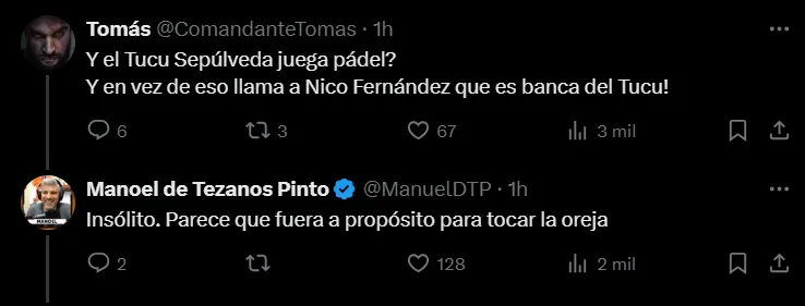Pero eso no fue todo. Ante la respuesta de un usuario que cuestionó la convocatoria de Nicolás Fernández -suplente de “Tucu” Sepúlveda en la U- en lugar del propio Sepúlveda, De Tezanos respondió de forma tajante: “Insólito. Parece que fuera a propósito para tocar la oreja”.