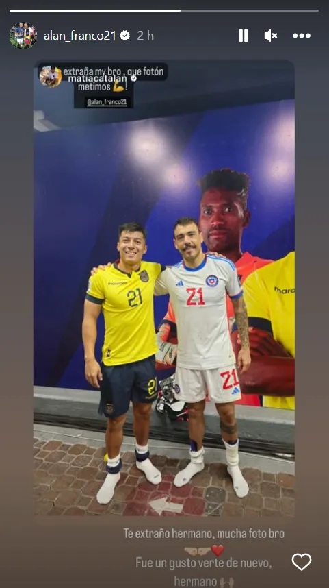 Eso quedó en evidencia con una historia que el Cata compartió en su Instagram este jueves 30 de noviembre. Allí subió una fotografía junto al “21” de Ecuador, quien en los 82′ ingresó en lugar de Kendry Páez. Franco ayudó a cumplir el objetivo y el partido quedó a favor de los locales.