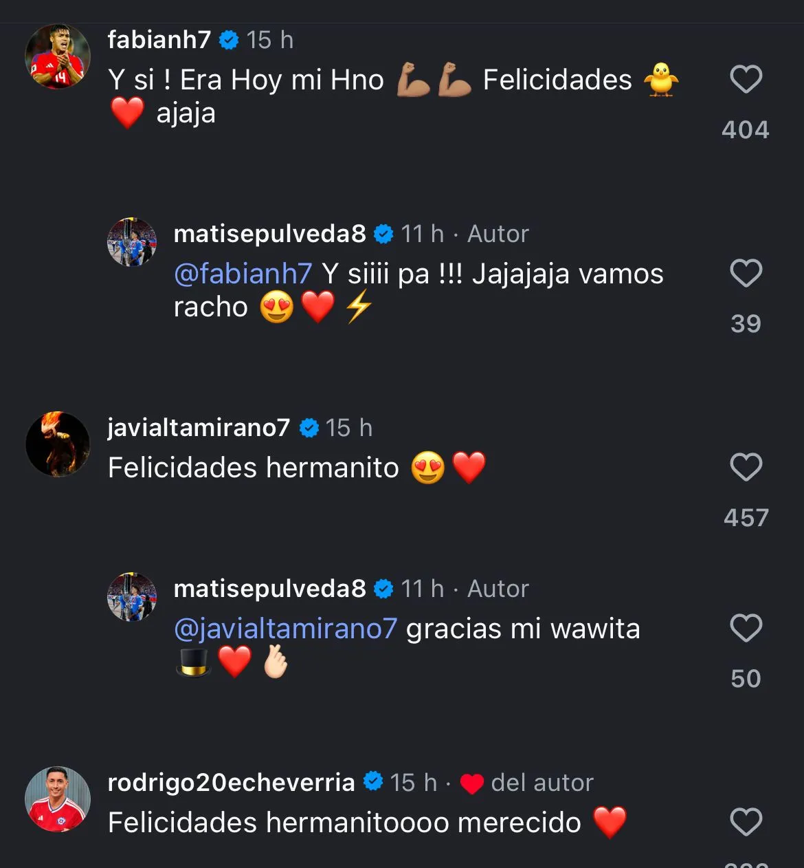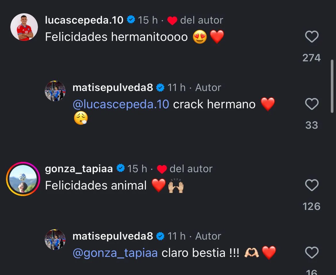 Lucas Cepeda, quien también fue parte de la gira de la Roja, y Tomás Alarcón, quienes compartieron en O’Higgins, le escribieron las felicitaciones, además del formado en la UC (hoy en Sao Paulo) Gonzalo Tapia.