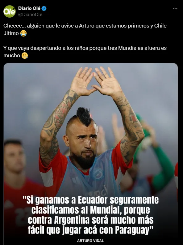Olé usó su plataforma de ‘X’ para responderle al King y junto a una imagen donde sale Arturo Vidal y las declaraciones antes mencionadas, el medio de prensa respondió “Cheeee… alguien que le avise a Arturo que estamos primeros y Chile último” junto a un emoji riendo.