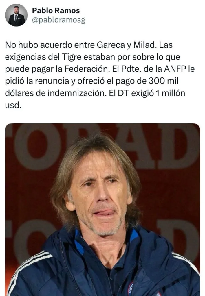 Con esto quedó claro que hubo mucha distancia entre ambas partes desde lo económico, por lo que fue imposible sacar a Gareca, quien llegará hasta el final de las Eliminatorias para el Mundial 2026.