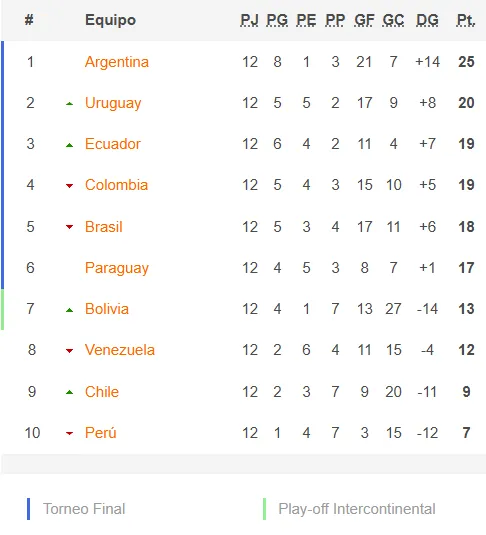Asimismo, Un empate de Brasil y Colombia sería positivo para que ninguno de los dos se aleje mucho y quedar “cerca” ante un posible derrumbe de alguno de los dos equipos. Argentina visita a Uruguay escapada en la punta de la tabla y a estas alturas irrelevante para la suerte nacional.