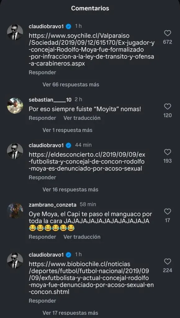 Claro que lo que Rodolfo Moya no esperaba, era que el mismo Claudio Bravo visitara su perfil de Instagram y le respondiera. El bicampeón de Copa América comentó en la publicación varios enlaces de polémicas que protagonizó el ex atacante, desde ofensa a Carabineros hasta una denuncia por acoso sexual.