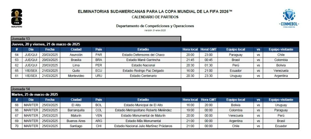 En la presente jornada, la Conmebol hizo oficial la programación de los duelos por las fechas 13 y 14 de las Eliminatorias Sudamericanas, donde además de los cotejos de Chile habrá dos clásicos, como Argentina ante Uruguay y el campeón del mundo contra Brasil.