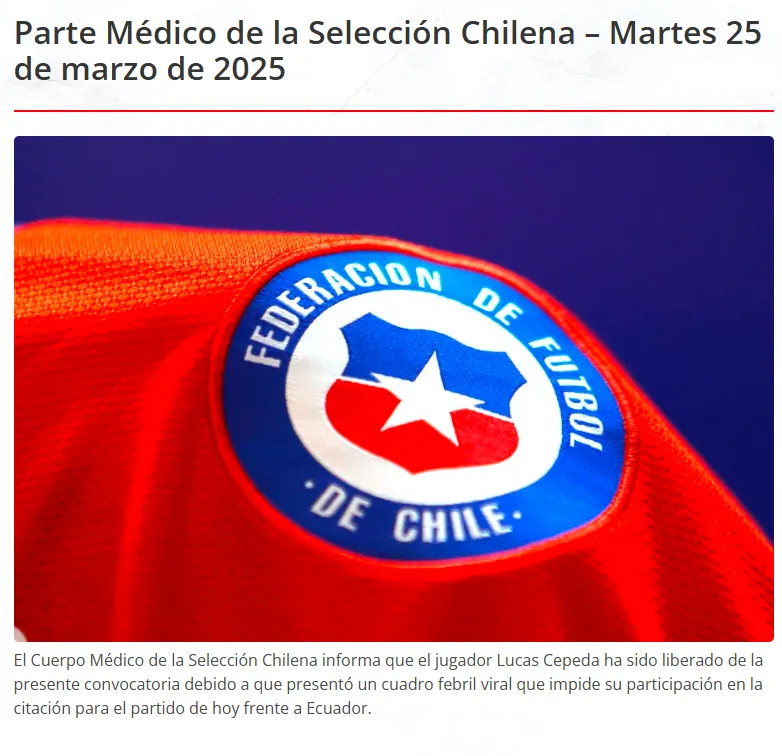 Sin embargo, en los últimos minutos, y mediante un comunicado oficial, La Roja dio a conocer que una de sus principales figuras, particularmente en los últimos dos encuentros por Eliminatorias, queda afuera de la convocatoria por una enfermedad, hablamos de Lucas Cepeda.
