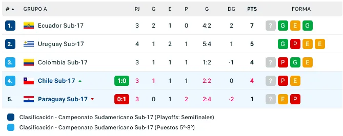 La tabla de posiciones del Grupo A del Sudamericano Sub 17