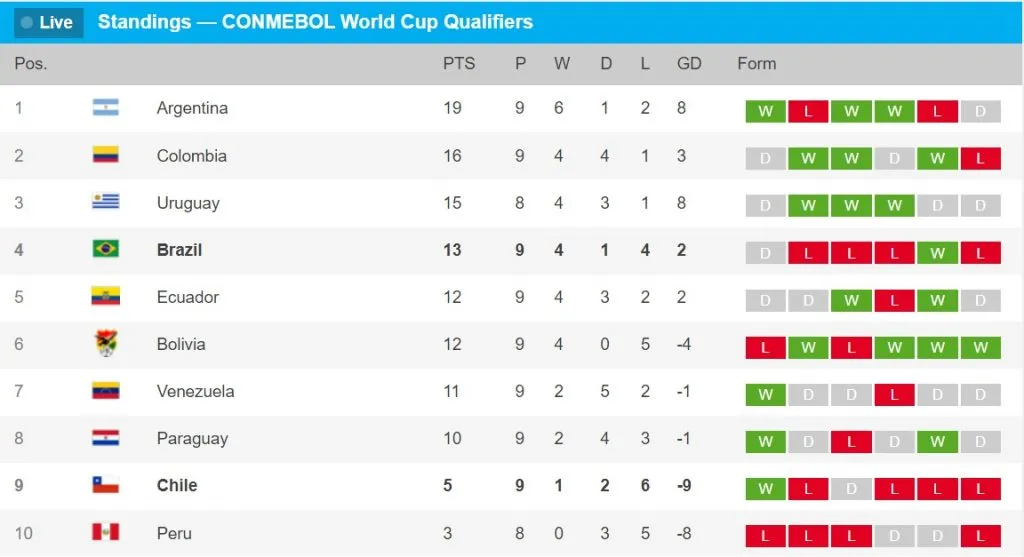 Por su parte, la Selección Chilena suma su sexto partido consecutivo sin sumar en Eliminatorias, y se queda en el penúltimo puesto con apenas cinco puntos, y viendo muy de lejos cualquier opción de meterse en la próxima Copa del Mundo.