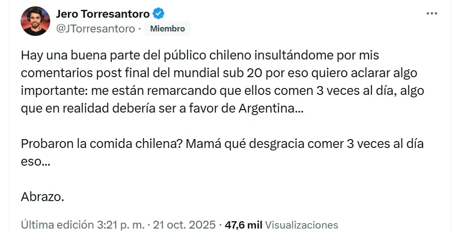 “Hay una buena parte del público chileno insultándome por mis comentarios post final del Mundial Sub 20, por eso quiero aclarar algo importante: me están remarcando que ellos comen 3 veces al día, algo que en realidad deberá ser a favor de Argentina… Probaron la comida chilena? Mamá, qué desgracia comer 3 veces al día eso…”, comentó mientras comía ají.