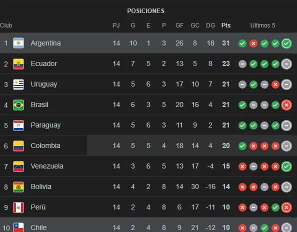 Actualmente, Chile ocupa el último lugar en la tabla con apenas 10 unidades en 14 encuentros, a cinco puntos de Venezuela, que se encuentra en zona de repechaje. Por su parte, Argentina ya tiene asegurada su presencia en el Mundial, liderando la clasificación con 31 puntos.