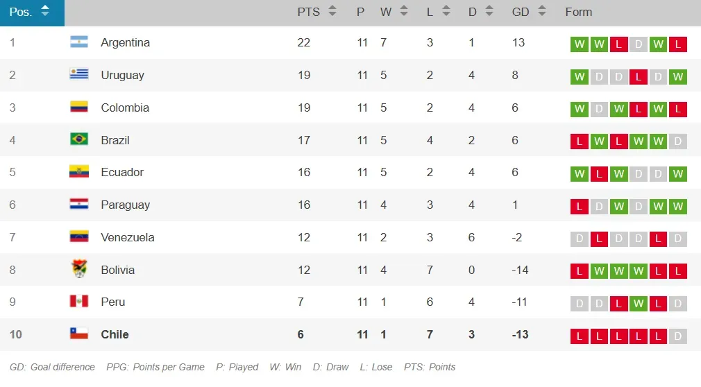 La Roja se mantiene como colista exclusiva de la tabla de posiciones en las Eliminatorias 2026 al cabo de 11 partidos.