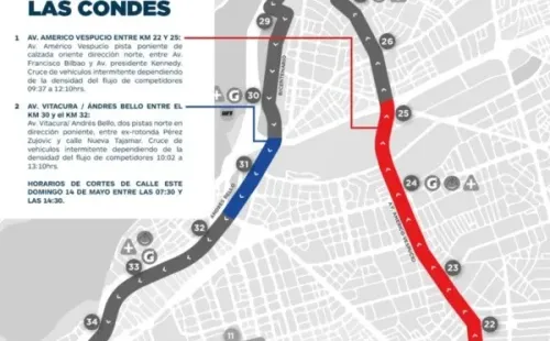 La mañana de este domingo 14 de mayo se realiza la Maratón de Santiago, el evento deportivo que recorrerá siete comunas de la ciudad. Por este motivo se anunció cierres y desvíos de tránsito en algunas calles.