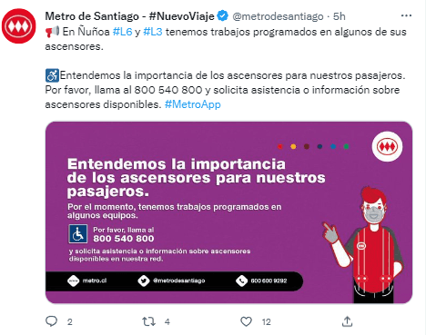 En la mañana de este martes 20de diciembre, Metro de Santiago anunció en su Twitter que en la estación de Ñuñoa en la Línea 3 y 6, hay trabajos programados en los ascensores.