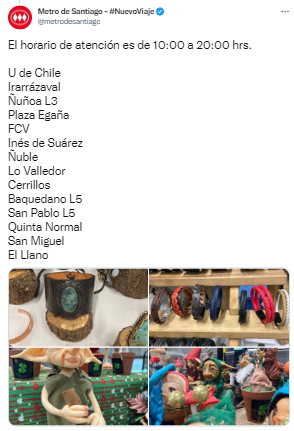 Cabe mencionar que en diversas estaciones del metro comoU de Chile, Irarrázaval, Ñuñoa L3, Plaza Egaña, FCV, Inés de Suárez, Ñuble, Lo Valledor, Cerrillos, Baquedano L5, San Pablo L5, Quinta Normal,San Miguely El Llano, se encuentran ferias artesanales.