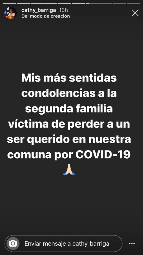 La noche de este viernes la alcaldesa de Maipú, Cathy Barriga, publicó en Instagram una historia informando de una segunda muerte por coronavirusen la comuna que dirige, además de enviarle condolencias a la familia.
