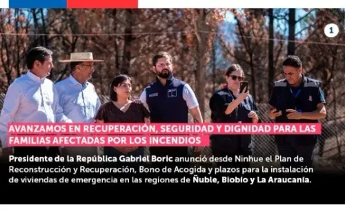 Desde la comuna de Ninhue, Región del Ñuble, el Presidente Gabriel Boric anunció el Plan de Reconstrucción de las zonas afectadas por los incendios forestales durante la temporada veraniega recién pasada. En total son 36 las medidas divididas en cinco ejes principales: Habitabilidad; Apoyo Sicosocial; Reactivación Productiva; Infraestructura Habilitante; Territorio y Sustentabilidad.