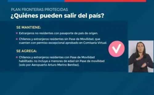 Adicionalmente a las personas que ya podían salir del país, a partir del lunes 26 de julio también podrán salir chilenos y extranjeros residentes con Pase de Movilidad habilitado: no incluye menores de edad sin Pase de Movilidad (solo por aeropuerto Arturo Merino Benitez).