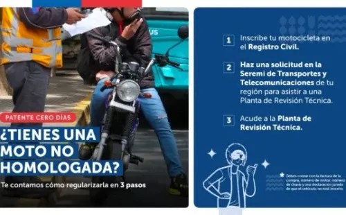 Mientras, en el caso de las motos “que circulen por calles y caminos del país tendrán el plazo de doce meses para obtener el certificado de revisión técnica respectivo; inscribirse en el Registro de Vehículos Motorizados del Servicio de Registro Civil e Identificación, y obtener su placa patente única”.