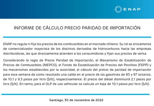 La Empresa Nacional del Petróleo (ENAP)informó este miércoles, el precio de las bencinas desde este jueves 1 de diciembre en Chile.