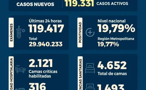 Se registróunapositividad de un 19,79%a nivel paísy de un 19,77% en la Región Metropolitana,lamentando elfallecimiento de 37personasa causa del virus.Destacando queloscasos activos son 119.331al día de hoy.