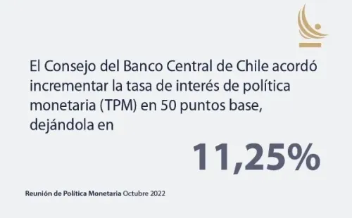 El Banco Central subió la Tasa de interés de Política Monetaria (TPM) en 50 puntos base, llegando al 11,25%, cifra que es calificada como el “nivel máximo en el ciclo iniciado en julio 2021”.